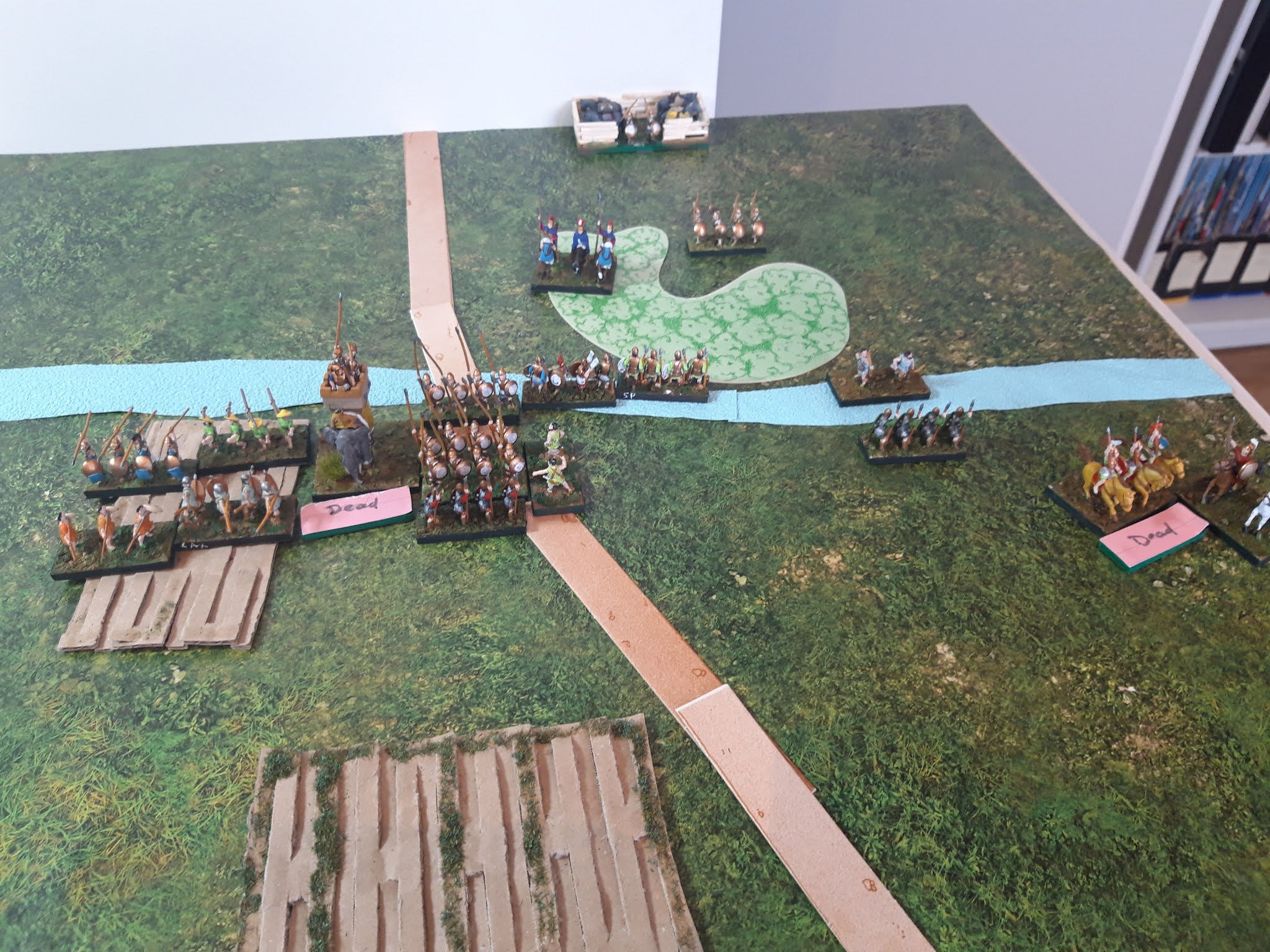 a) Carthage Pips= 2: the second Ps go on the left edge of the forest to block the advance of the Cv and the 3Ax align withe the first Ps.